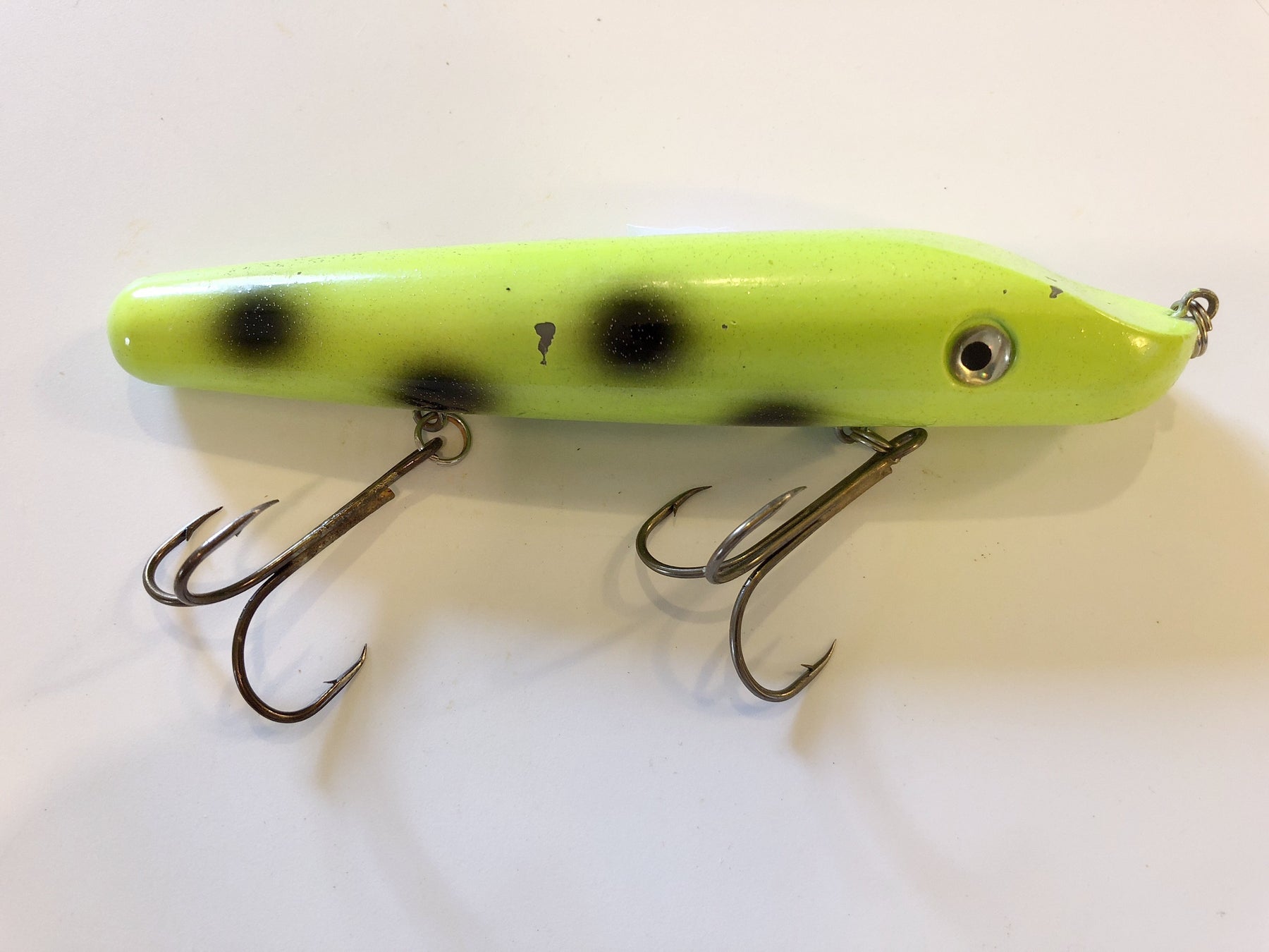 Musky Lure Big Heavy Green Machine.  Not sure who made this but it is a big, about 7" long, heavy lure.  Used with paint flaking off one side.  Still great for fishing, especially at this price.