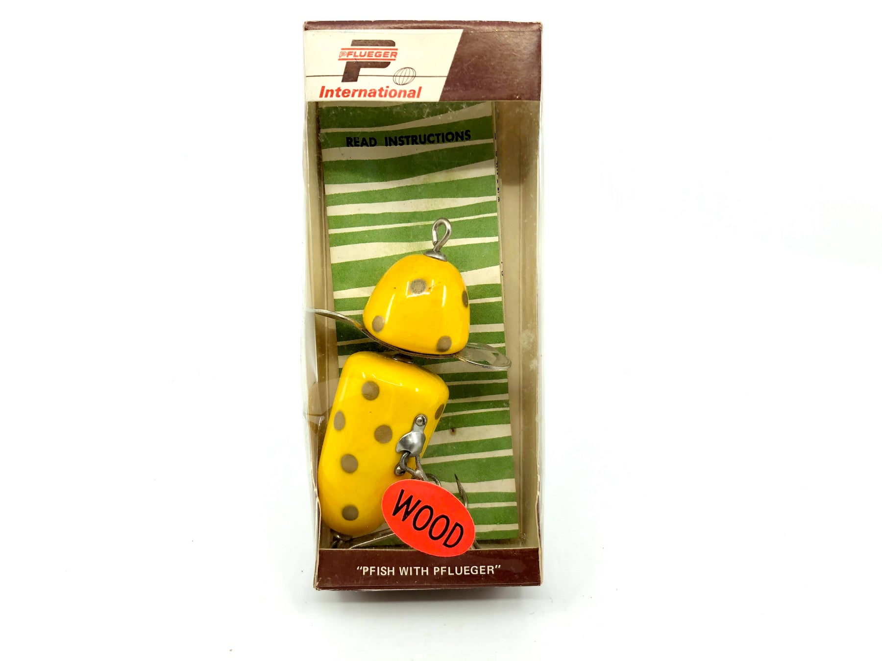 Pflueger Globe 3750 Yellow Gold Spots Color New in Box Small Size. Great vintage bait! 2 3/4" long. Wooden lure. New in box. I did not open. Box in nice shape, lure new inside. Great vintage lure, tough to find these anymore. Add to your collection or tackle box. One of the all time classic fishing lures. See photos.