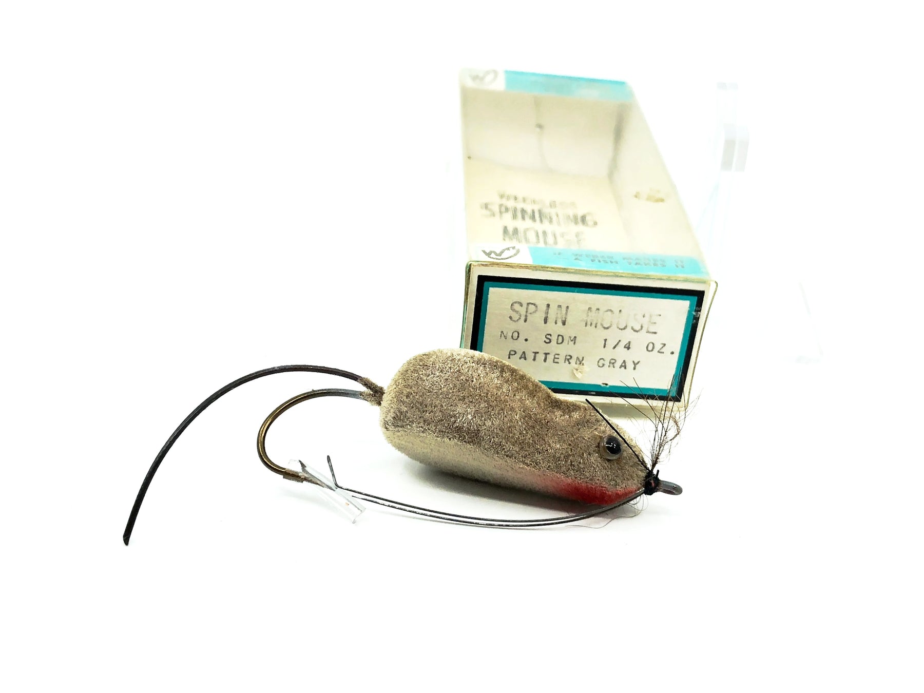 Weber Weedless Spin Mouse Gray Color with Box Old Stock 1/4 oz Size. About 2" long body not including hook or tail. Great vintage lure here and a tough one to find. Comes with matching box. Vintage lure is used with some minor wear from sitting in the box but overall in very good condition. Box has some minor wear but overall in good shape. Nice combo. This one won't last long so grab it for your collection while you can. See photos.