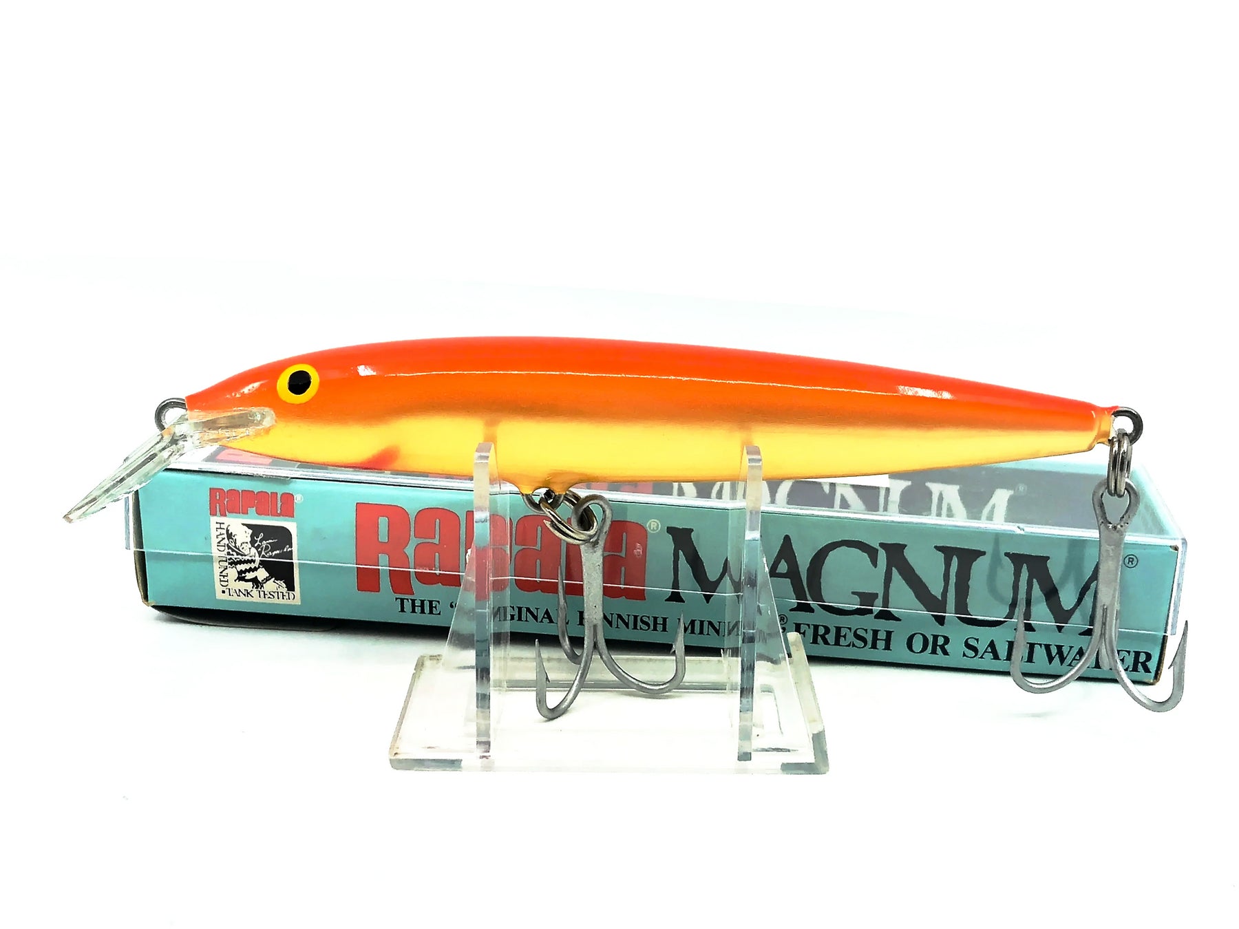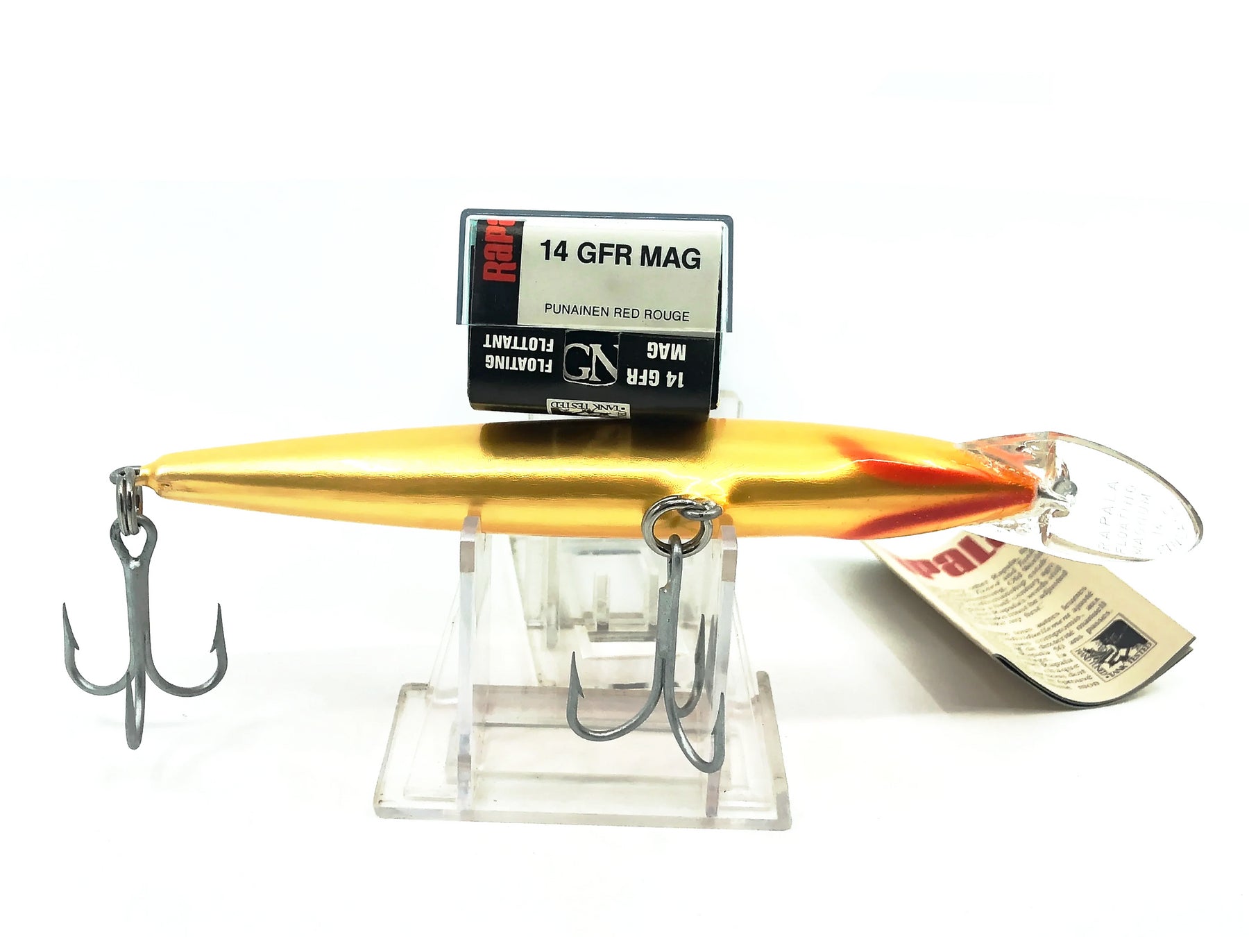 Rapala Floating Magnum FMAG-14, GFR Gold Fluorescent Red Color with Box. Hard to find discontinued Rapala here. Lure body is about 5 1/2" long. This Rapala is new in box and the box is in great condition. Collect or fish classic Rapala lure. See photos.